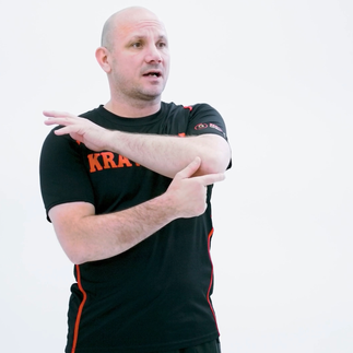 Pictures: Krav Maga Master Gheorghe Husar demonstrating the close range elbow strike in online tutorials. See below.